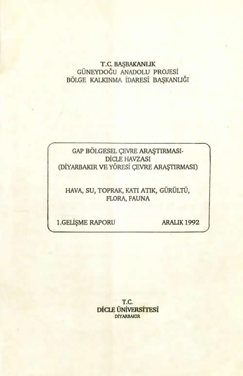 GAP BÖLGESEL ÇEVRE ARAŞTIRMASI DİCLE HAVZASI(DİYARBAKIR VE YÖRESİ ÇEVRE ARAŞTIRMASI)HAVA,SUTOPRAK,KATI ATIK,GÜRÜLTÜ,FLORA,FAUNA 1.GELİŞME RAPORU ARALIK 1992