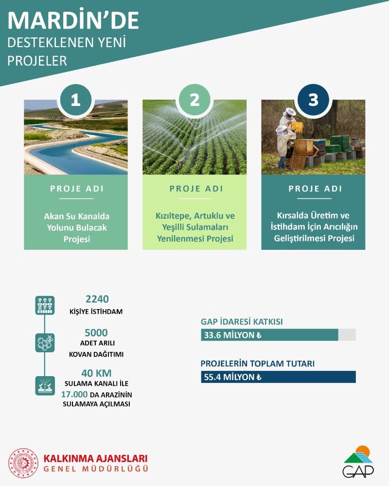 GAP İdaresi ve Mardin Valiliği arasında imzalanan çerçeve protokolü kapsamında, “Akan Su Kanalda Yolunu Bulacak” , “Kızıltepe, Artuklu ve Yeşilli Sulamaları Yenilenmesi” ve “Kırsalda Üretim ve İstihdam İçin Arıcılığın Geliştirilmesi” projelerinin hayata geçirilmesiyle; 2.240 kişiye istihdam sağlanması, 5000 adet arılı kovan dağıtımının yapılması ve 40 km sulama kanalı ile 17.000 dekar alanın sulamaya açılması hedefleniyor.