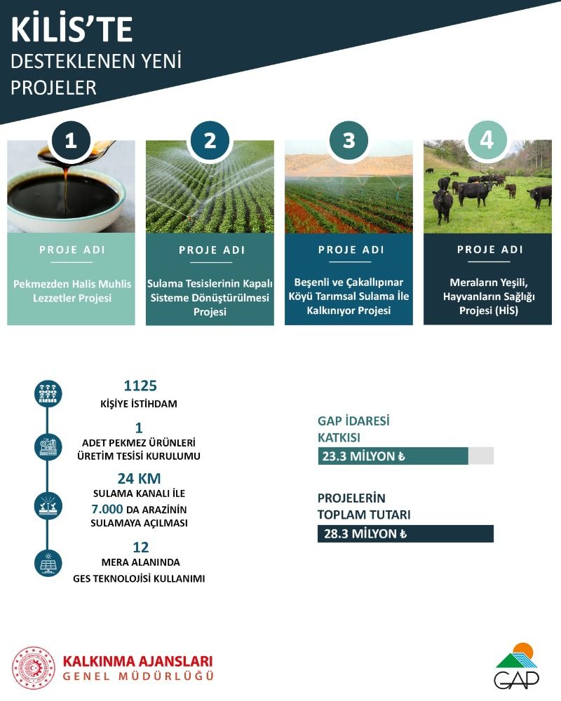 GAP İdaresi ve Kilis Valiliği arasında imzalanan çerçeve protokolü kapsamında, “Pekmezden Halis Muhlis Lezzetler” , “Sınırlı Sorunlu, BüyükKonak, KüçükKonak, Karamelik, Çürten Köyleri Sulama Tesislerinin Kapalı Sisteme Dönüştürülmesi” , “Beşenli ve Çakallıpınar Köyü Tarımsal Sulama ile Kalkınıyor” ve “Meraların Yeşili, Hayvanların Sağlığı” projelerinin hayata geçirilmesiyle; 1125 kişiye istihdam sağlanması, 12 mera alanında GES teknolojisinin kullanılması, 1 adet pekmez ürünleri üretim tesisinin kurulması ve 24 km sulama kanalı modernizasyonu ile 7000 dekar alanın modern sulama altyapısına kavuşturulması hedefleniyor.