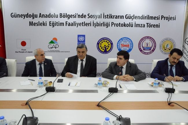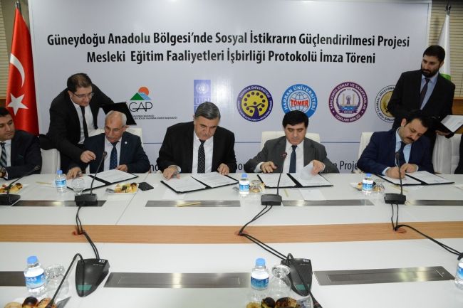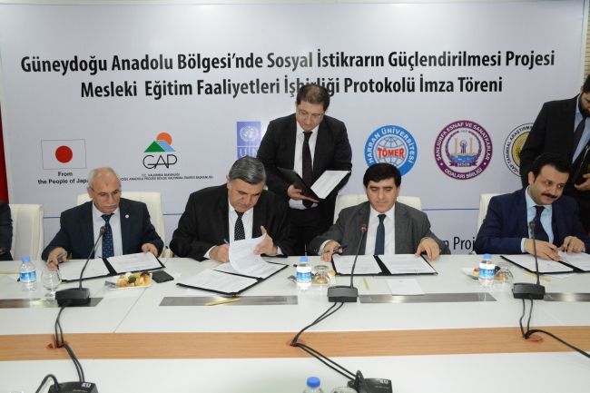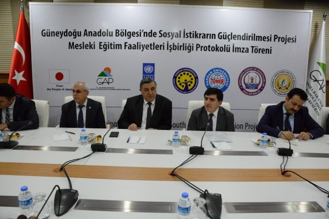 GAP Bölge Kalkınma İdaresi Başkanlığı ve Birleşmiş Milletler Kalkınma Programı (UNDP) teknik desteğiyle hayata geçirilen ve Japonya Hükümeti tarafından finanse edilen Güneydoğu Anadolu Bölgesi’nde Sosyal İstikrarın Güçlendirilmesi Projesi Mesleki Eğitim Faaliyetleri İşbirliği Protokolü, 2 Şubat’ta GAP Bölge Kalkınma İdaresi Başkanlığında düzenlenen törenle imzalandı. Harran Üniversitesi Sürekli Eğitim ve Uygulama Araştırma Merkezi (HARÜSEM), Türkçe Öğretimi Uygulama ve Araştırma Merkezi (TÖMER), Şanlıurfa Esnaf ve Sanatkârlar Odası Birliği (ŞESOB) ve GAP Tarımsal Araştırma Enstitüsü Müdürlüğü (GAPTAEM) işbirliğinde yürütülen projenin “İstihdam Edilebilirlik ve Geçim İmkânları” başlıklı ilk bileşeni kapsamında, bin 375 Suriyeli ve 375 Türkiye vatandaşı olmak üzere toplam bin 750 kişiye sanayi, hizmet ve tarım sektörlerinde toplam 75 kurs verilecek.