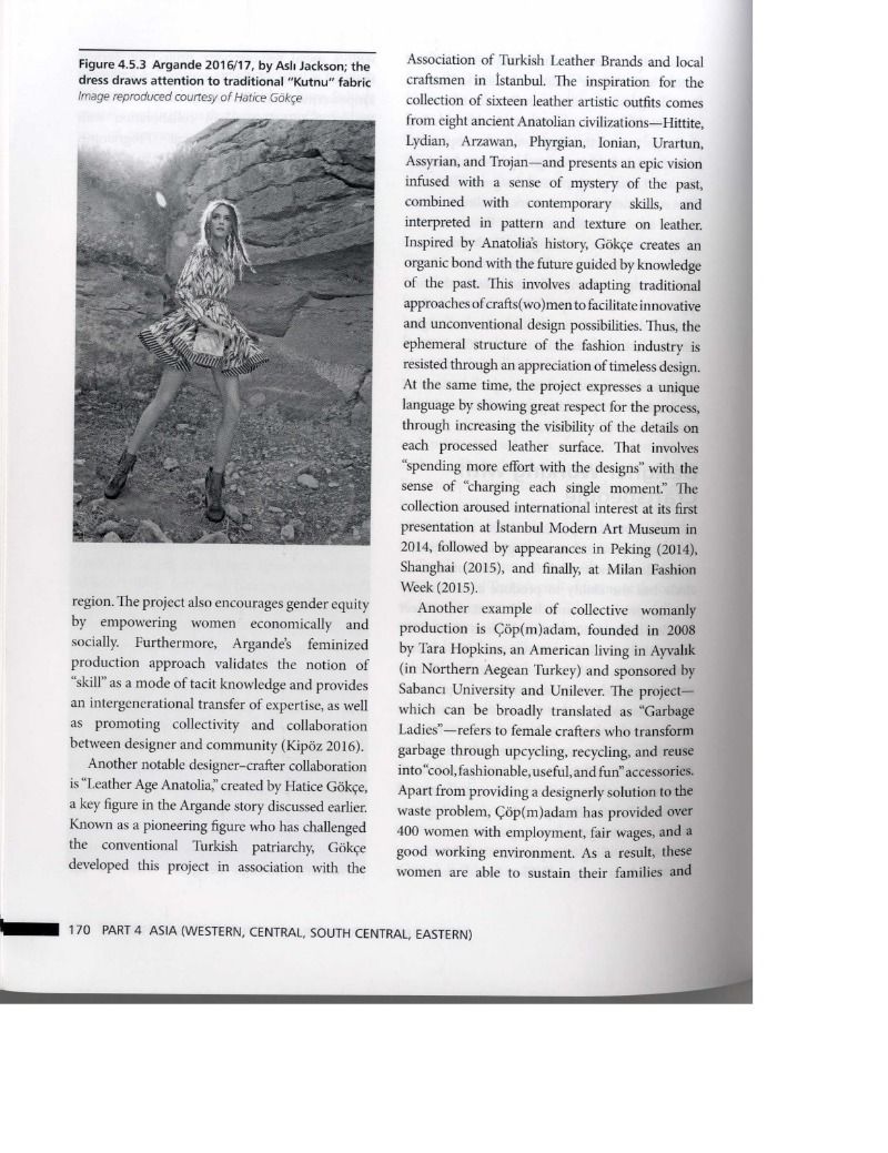 GAP Bölge Kalkınma İdaresi Başkanlığı ve Birleşmiş Milletler Kalkınma Programı (UNDP) tarafından yürütülen kadınların güçlendirilmesine yönelik çalışmalar kapsamında tasarımcı Hatice Gökçe’nin tasarım koordinatörlüğünde geliştirilen Argande markası ‘Global Perspective on Sustainable Fashion (Sürdürülebilir Modaya Küresel Bakış Açıları)’ adlı kitapta son yıllarda çok önem kazanan sürdürülebilir moda alanında sosyal sürdürülebilirlik modeli olarak ele alıyor.