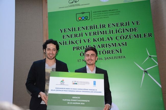GAP Bölge Kalkınma İdaresi Başkanlığı tarafından UNDP teknik desteğiyle yürütülmekte olan “GAP Bölgesi’nde Yenilenebilir Enerji Kaynaklarının Kullanımı ve Enerji Verimliliğinin Arttırılması Projesi” kapsamında düzenlenen “Yenilenebilir Enerji ve Enerji Verimliliği Alanlarında Yenilikçi ve Kolay Çözüm Önerileri Yarışması” Final ve Ödül Töreni 16-17 Mayıs tarihlerinde Şanlıurfa GAP Tarımsal Araştırmalar Eğitim Merkezi’nde gerçekleştirildi.